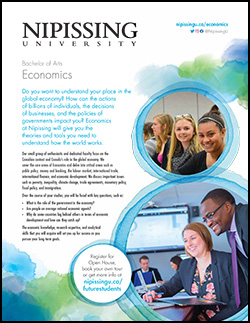 Economics at Nipissing will introduce you to theories and economic models that will give you a solid framework for understanding how the world works. The structure of the Canadian economy, public policy, money, banking and financial institutions, the labour market, and the inter-dependence of nations in the global economy are all topics you will come to grasp with confidence.