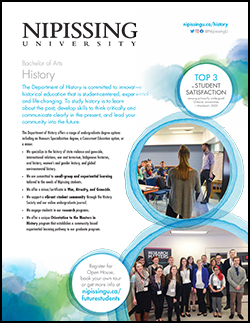 My experience with the History Department at Nipissing has completely changed the way I view the world around me, particularly concerning indigenous/non-indigenous relations in Canada. As I work toward a career in the social services sector, my background in Canadian History will be extremely valuable, and a minor in History is an ideal complement to a Social Welfare degree.