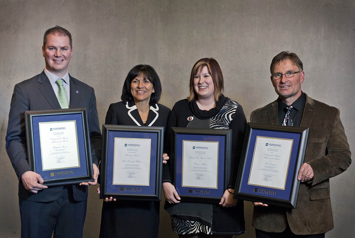 October 25-27 saw record breaking crowds at Nipissing’s annual Homecoming, and no wind, rain or snow could dampen the crowds’ spirits. There were 1,000 registered attendees, almost double from any previous year. The weekend was filled with awards, sporting events, food and more. Homecoming is a chance to meet up with old friends and make some brand new ones.The weekend kicked off on Friday night with the Alumni Awards Reception where the achievements of four graduates were celebrated with alumni awards and one individual was recognized with honorary alumni status. The night was truly inspiring.