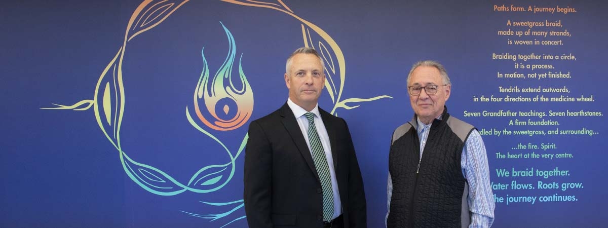 (L-R) Kevin Wamsley, President and Vice-Chancellor, Nipissing University, and Maurice Switzer, Chair, Nipissing University Indigenous Council on Education, pictured in front of a visual representation of the University's new strategic plan. The artwork greets visitors to the University as they step inside its front doors, serving as a reminder of Nipissing’s commitments and its ongoing journey to fulfill them.
