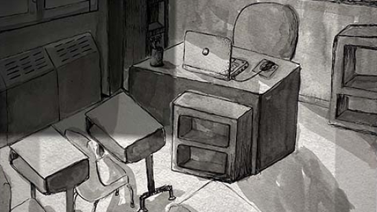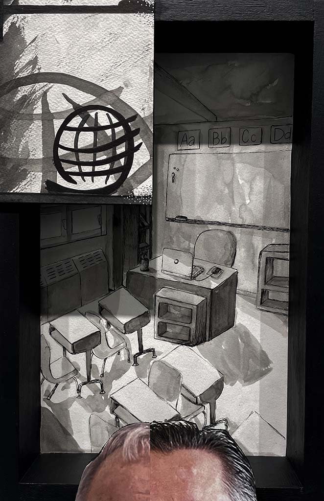 india ink, micron pen, and collage on watercolour paper, 17.5 x 11.5 x 3.5 inches, 2021Emily House