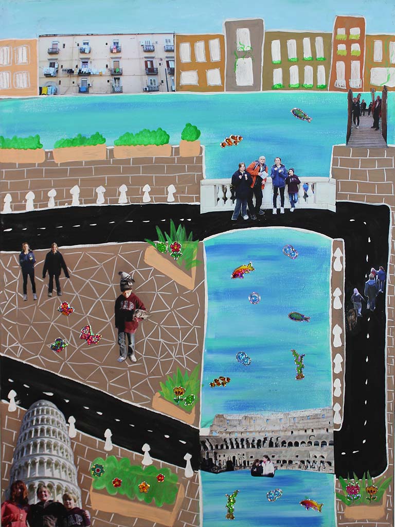 acrylic paint, mixed media, found additions, 12 x 12 inches, 2022Elizabeth Mazzuca