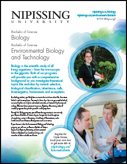 Graduates of the Environmental Biology and Technology program receive a Bachelor of Science degree from Nipissing and an Environmental Technician - Protection and Compliance diploma from Canadore College.