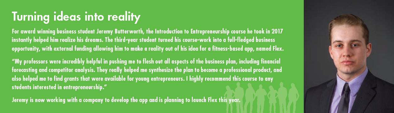 For award winning business student Jeremy Butterworth, the Introduction to Entrepreneurship course he took in 2017 instantly helped him realize his dreams. The third-year student turned his course-work into a full-fledged business opportunity, with external funding allowing him to make a reality out of his idea for a fitness-based app, named Flex.