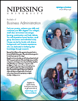 If you want to prepare for a career, and for life in general, Nipissing’s School of Business offers a unique approach to learning that gives you more than a degree. Along with core business knowledge, our faculty will help you develop professional and social skills. The programs combination of theoretical background, practical skills, experience, independent thinking, and problem solving will give you an advantage and better chance of success in a competitive market.