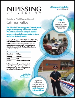 At Nipissing you have the option to focus on one of our four streams: Policing, Corrections, Criminology or Criminal Justice Studies. Our flexible program is designed to give you a balanced combination of theory and practice. Through field placements, projects, and research, you will have opportunities to work alongside real criminal justice professionals.