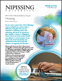 Nipissing takes pride in knowing that, as a graduate of the nursing program, you will be equipped with the required nursing knowledge, skills, and competencies that you will need to meet your goals. You will be well positioned to work within the many domains of nursing such as public health, community and hospital nursing, health education, and case management. You may also consider future directions in academic or research institutions, furthering your education with graduate studies, or starting your career in today’s complex health care system, research-related jobs,or administration. Whatever career path you choose, Nipissing will have prepared you for a rewarding and challenging experience