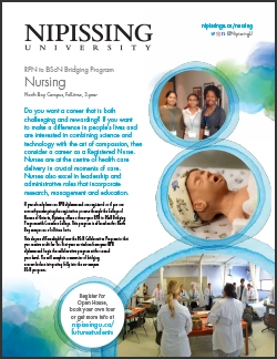 If you already have a RPN diploma and are registered, or currently undergoing the registration process through the College of Nurses of Ontario, Nipissing offers a 3-year RPN to BScN Bridging Program. The program is offered on the North Bay campus on a full-time basis, where students complete a semester of bridging courses and then integrate fully into year two of the four year on-campus program.​​​