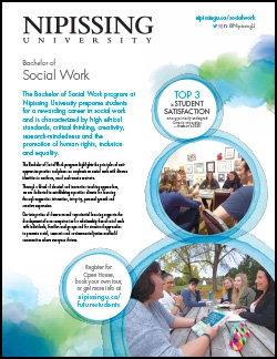 General enquires about the BSW program at Nipissing University, please contact socialwork@nipissingu.ca, 705.474.3450 ext 4029
