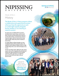 ​Funding is available to graduate students from both internal and external sources. Internal funding includes teaching/research assistantships, faculty research grants, and Nipissing Graduate Scholarships. The value of these scholarships varies. Students are also encouraged to compete for scholarships from the Social Sciences and Humanities Research Council (SSHRC), the Natural Science and Engineering Research Council (NSERC), the Canadian Institutes of Health Research (CIHR), the Ontario Graduate Scholarships (OGS), the Canada Graduate Scholarship, and the Mackenzie King Memorial Scholarship.