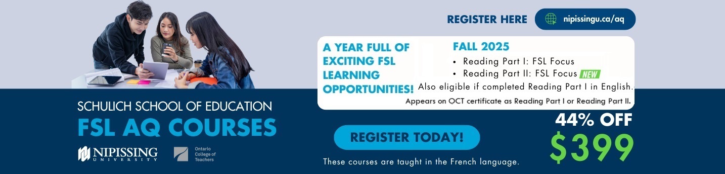 The prestigious Schulich School of Education at Nipissing University provides In-Service courses for teachers including: Additional Qualification (AQ) courses and Additional Basic Qualification (ABQ) courses.