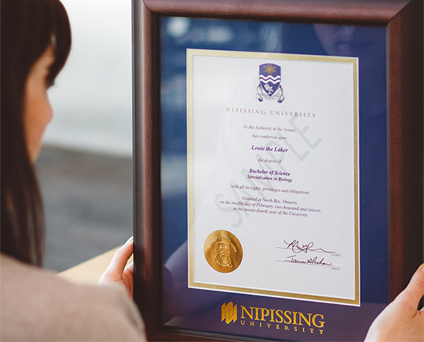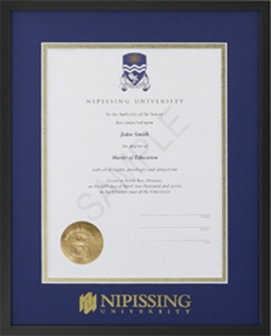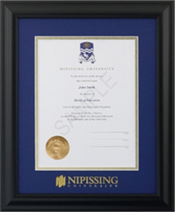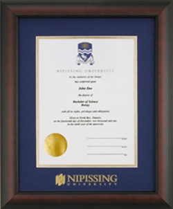 Proudly showcase your achievement by framing your degree in a high-quality, black tone frame, complete with an acid-free single mat emblazoned with Nipissing University.