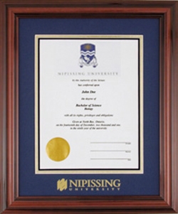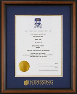 The top of the line 'Diplomat' poplar degree frame is made from a solid hardwood imported Italian molding with a highly lacquered mahogany coloured finish. The degree is accentuated by an acid-free triple mat, featuring Nipissing University in gold.