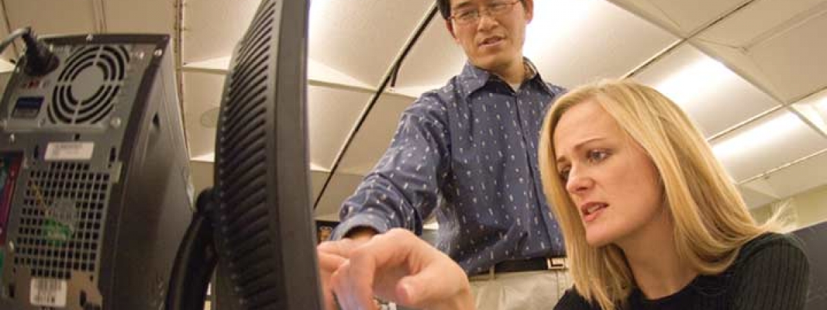 Dr. Haibin Zhu provides one-on-one assistance to students in his Computer Science courses. Dr. Zhu researches efficiency and how people and computers collaborate with other people and computers