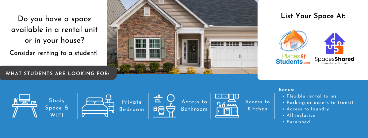 Nipissing University’s Off Campus Living Program is dedicated to providing students who choose to live off campus with the support and resources they need to become informed residents, promoting active participation in the community and on campus. By providing access to advertising websites, through Places4Students and SpacesShared, students have access to a variety of housing options to suit their specific needs.