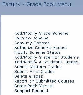 The Grade Book Menu can be found under the Faculty Information Menu under the faculty Menu.