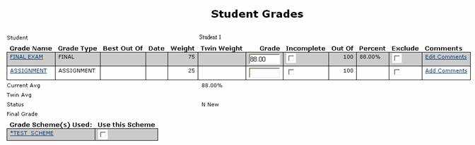 If the student’s grades have been finalized and verified, this screen will be read-only. There is a hyperlink on the grade name that will allow User to view all of the student’s grades for that particular test. There is also a hyperlink on the grade scheme name that display’s the grade scheme information for the selected grade scheme.