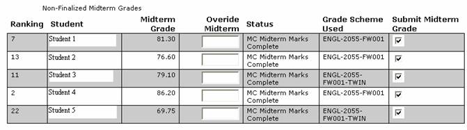 If all tests have grades entered that have been flagged as part of the midterm grade then the status will display as Midterm Marks Complete (MC) and the checkbox submit midterm grades will be checked by default. If the status is not MC then the submit midterm grades checkbox will be unchecked. You also have the ability to override the calculated midterm grade.
