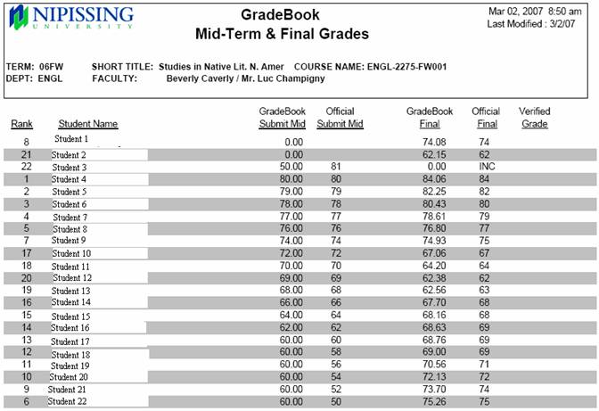 When the grades are submitted Faculty will receive an email stating all of the students who have midterm marks submitted and if there are remaining students in the course whose midterm marks have not been submitted. Also, faculty will receive a report displaying the grade book midterm marks and the midterm marks stored in the students.course.sec file.
