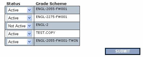 This function allows faculty to change the status of their Grade Scheme’s to Active or Not Active. If the status is Not Active, the grade scheme will no longer display in any lists where you select Grade Scheme such as the Add/Modify Grade Scheme screen.