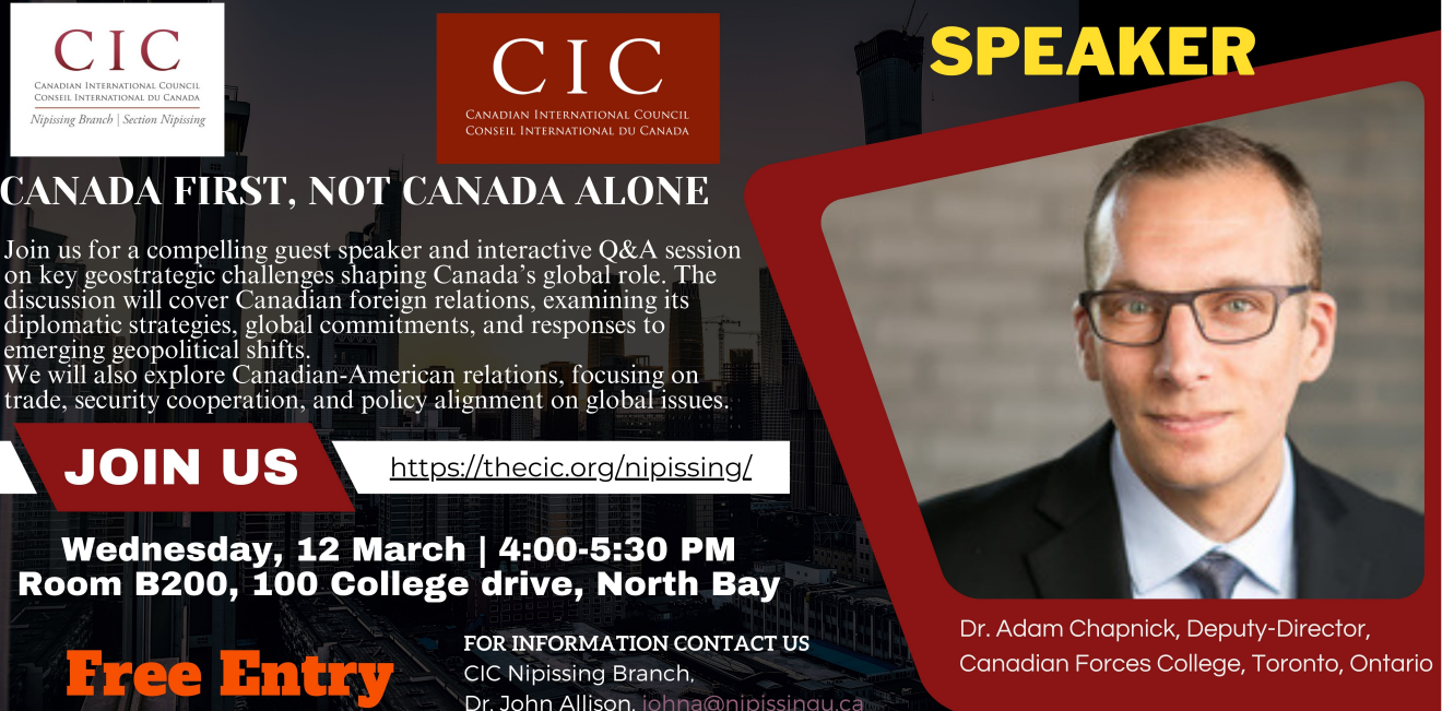 The Canadian International Council (CIC) Nipissing Branch is pleased to welcome Dr. Adam Chapnick, Deputy Director of the Canadian Forces College and professor at the Royal Military College.