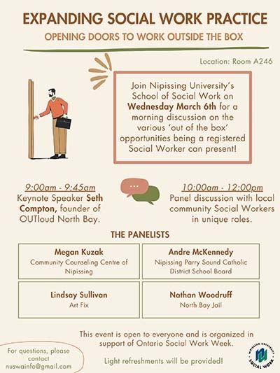 Join Nipissing University's School of Social Work on Wednesday March 6th for a morning discussion on the various 'out of the box' opportunities being a registered Social Worker can present!