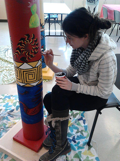 “The legend is a world view, belief system, paradigm, cosmology and being such, infuses native art with all things that lead out of it,” says Stahle-Fraser. “For the last few weeks of the Native Creativity and the Arts course, my students and I decided to visually depict this legend using native styles of art for each of the four columns, representing the directions. These columns will support a sky scene from which Sky Woman falls down onto the back of the Turtle.”