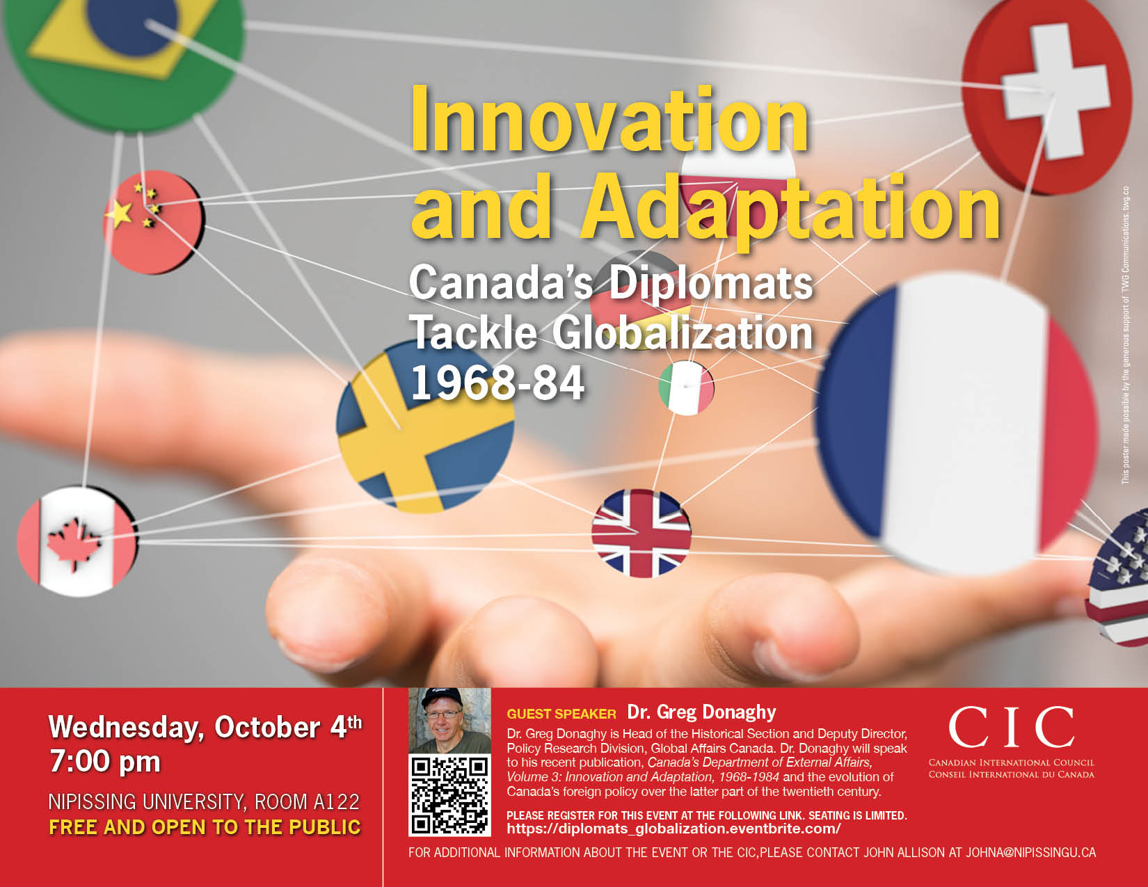 The Canadian International Council (CIC) Nipissing District Branch welcomes Dr. Greg Donaghy to Nipissing’s campus for a special lecture on foreign policy on Wednesday, October 4, at 7 p.m. in room A122.