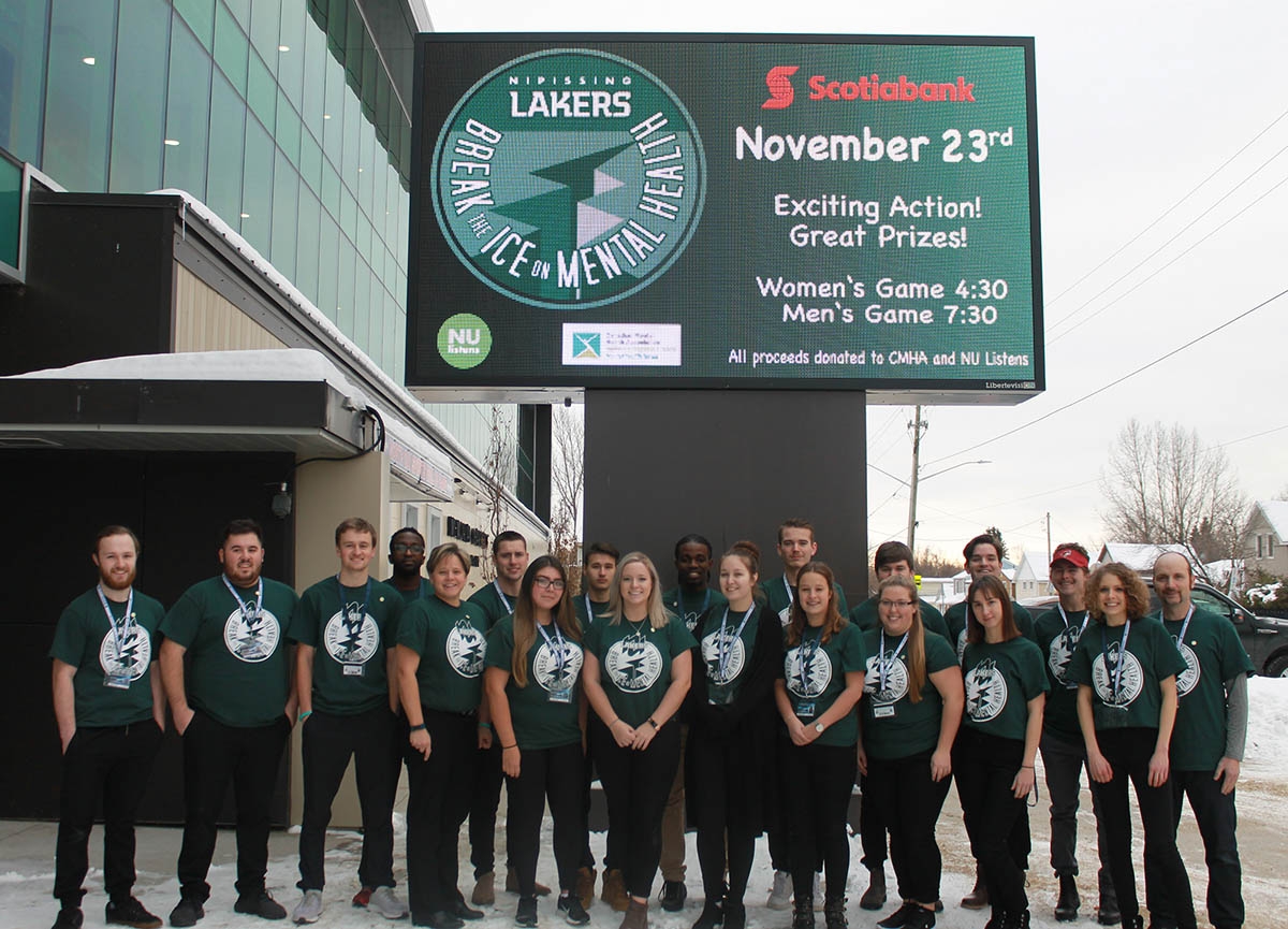 The Nipissing University Sport Marketing class is proud to announce that the 2018 Lakers Break the Ice on Mental Health event raised $8,264 to support mental health in our community. Past event results were surpassed this year as more than 750 fans were in attendance to cheer on our Lakers teams and to support mental health awareness and fundraising efforts. Proceeds from this event will assist the Canadian Mental Health Association (Nipissing Regional Branch) and NU Listens in delivering essential mental health support programs within our community. Scotiabank has been an important partner for several years and we thank them and the many other organizations and individuals that have championed these important efforts through sponsorships, donations, and fundraising participation. We are fortunate to be part of such a caring and giving community.