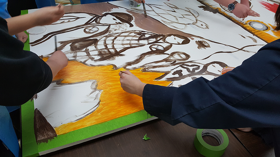 McComb’s two major art projects during the residency were two large murals. One was a four-panel mural divided between the four high schools. Students would create imagery that represented their school and reflected their thoughts on reconciliation. The four panels are meant to fit together cohesively. The second mural is shared between the two communities of Hearst and Constance Lake, two communities divided by distance and differences in language and culture. The mural projects encourage communication and teamwork among people of both communities.