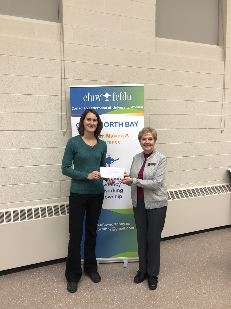 Nipissing University PhD student, Melissa Corrente, accepts a $1,000 scholarship cheque from CFUW past president, Brenda Robertson as part of CFUW’s 100th anniversary celebrations.