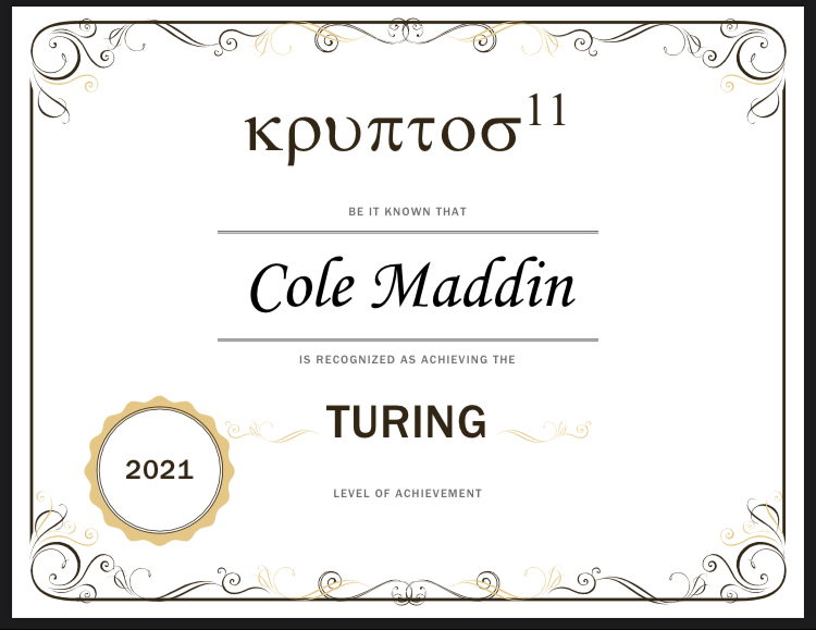 Cole and David were also recognized as Master Codebreakers as they were one of only 10 teams who solved all three challenges and they received the TURING level of achievement. Congratulations to Cole and David!