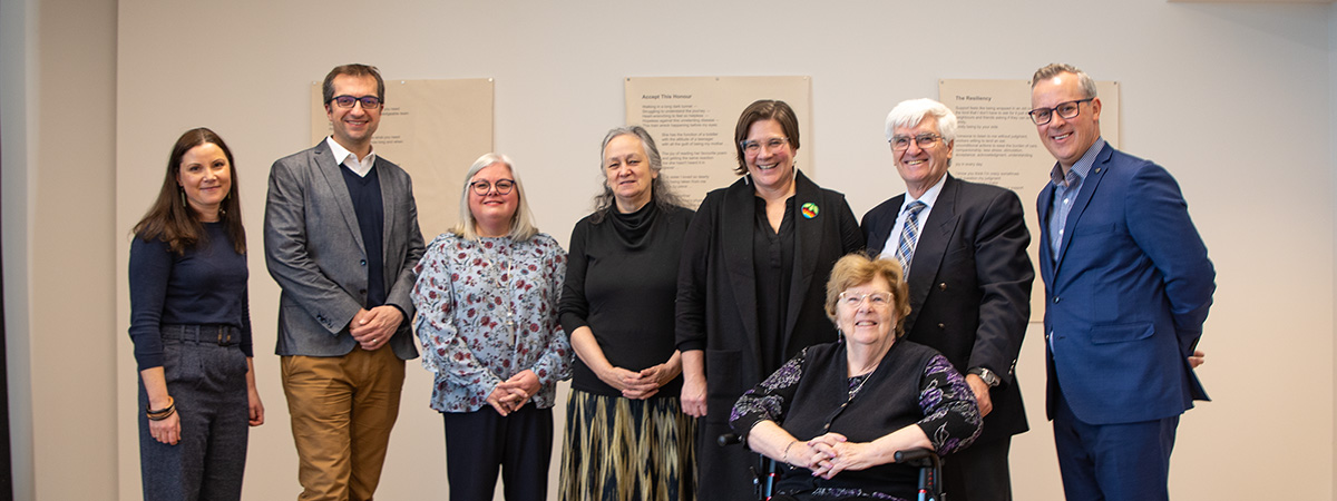 (L-R) Back: Dr. Veronika Williams, Associate Professor, Nipissing University and Collaborator, Rare Dementia Support Canada; Dr. Sebastian Crutch, professor of Neuropsychology, Dementia Research Centre, UCL, and Lead, Rare Dementia Support; Dr. Mary Pat Sullivan, Professor of Social Work and Social Gerontology, Nipissing University and RDS Canada Lead; Dorothy Larkman, Assistant Professor, Nipissing University School of Social Work; Jen Gordon, Support Manager, Rare Dementia Support Canada; Ernest Payette, Rare Dementia Support Canada member; Dr. Jeffrey Coull, Hilary and Galen Weston Family Foundation. Front: Caroline Payette (front), Rare Dementia Support Canada member.