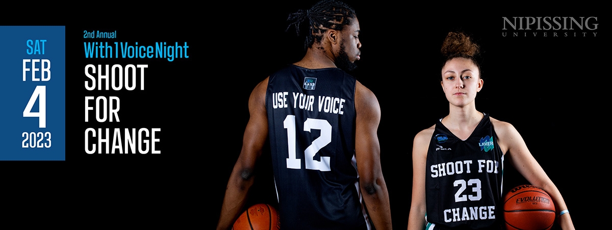 North Bay, ON – This Saturday, the Nipissing University Black Association for Student Expression (NUBASE) in partnership with Lakers Basketball will host the 2nd Annual With1VoiceNight: Shoot for Change Game at the R.J. Surtees Student Athletics Centre against 705 rivals, the Laurentian Voyageurs. Created by NUBASE Co-Founder and President, Taijon Eccleston-Graham, Shoot for Change raises funds for BIPOC student bursaries at Nipissing University and offers student-athletes a platform to advocate for marginalized communities.