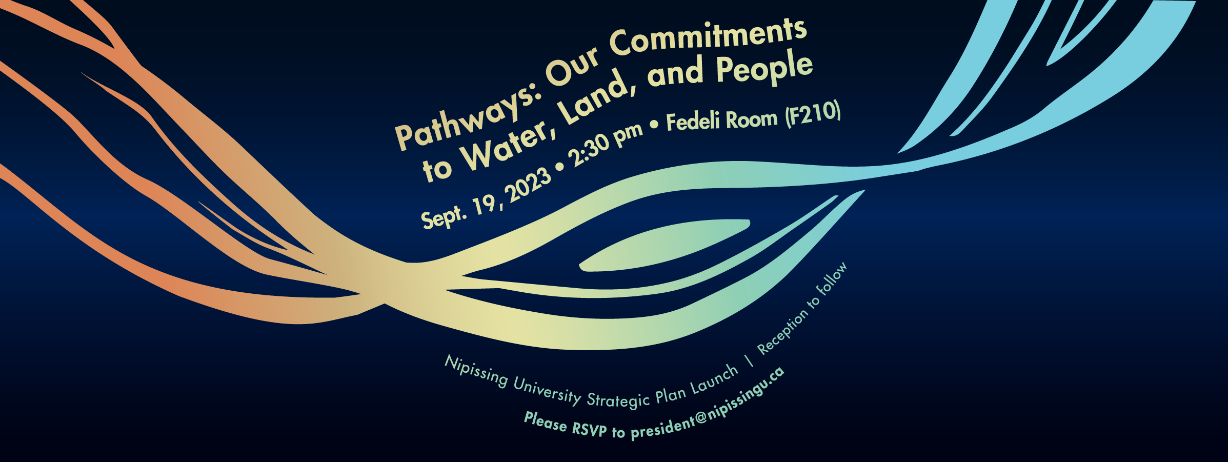 North Bay, ON – Nipissing University invites members of the community to join in celebrating the official launch of its new strategic plan entitled, “Pathways: Our Commitments to Water, Land, and People for the Next Seven Generations at Nipissing University”, taking place on Tuesday, September 19 from 2:30 p.m. to 3:30 p.m. in the Fedeli Room (F210) at Nipissing University (100 College Drive, North Bay, ON).