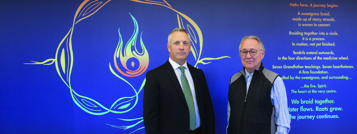 (L-R) Kevin Wamsley, President and Vice-Chancellor, Nipissing University, and Maurice Switzer, Chair, Nipissing University Indigenous Council on Education, pictured in front of a visual representation of the University's new strategic plan. The artwork greets visitors to the University as they step inside its front doors, serving as a reminder of Nipissing’s commitments and its ongoing journey to fulfill them.