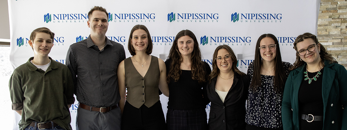 from left to right: Nipissing University's 3MT® presenters, Campbell McLean, Kieran Martin, Sophia Milner, Jaden Gilbert, Michelle Campbell, Cassidy Brooks and Katelyn Macintosh.
