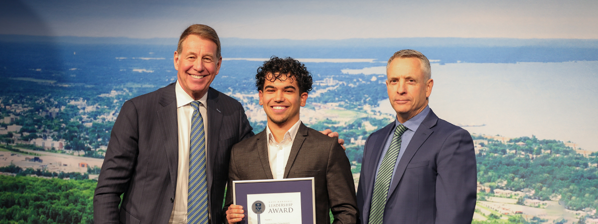 (left to right) Dr. Scott Russell, Chancellor of Nipissing University, Alexander Domingos, DMLA Recipient in the Campus category, and Dr. Kevin Wamsley, President and Vice-Chancellor of Nipissing University